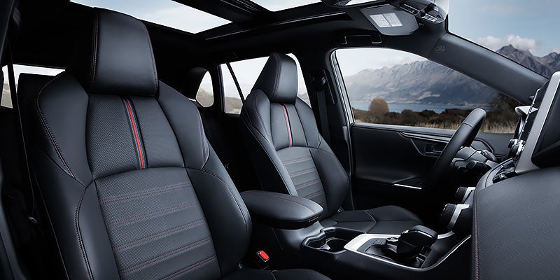 A cockpit designed with drivers—and style—in mind. Available Black SofTex® -trimmed seats with red contrast stitching help emphasize the sporty side of RAV4 Prime. Standard heated front seats help make it easy to dial in the right amount of comfort.