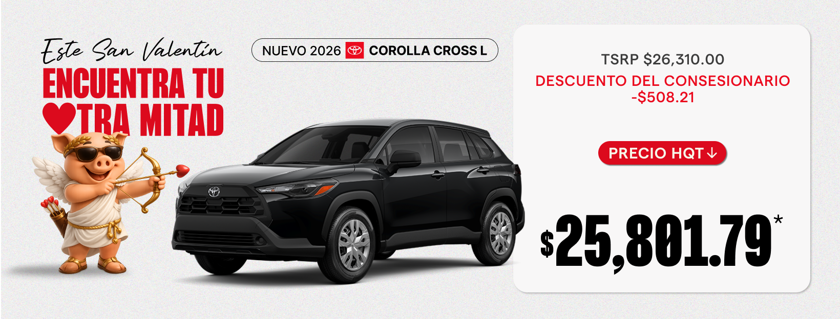 *Nuevo Toyota Corolla Cross L 2026 Modelo# 6301. VIN# 7MUAAAAG0TV175083 TSRP: $26,310.00 Ahorro: $508.21 Precio de venta: $25,801.79 Debe tomar entrega del inventario en stock del concesionario. Imágenes solo con fines ilustrativos. Las ofertas no pueden combinarse con ciertas otras ofertas, consulte al concesionario para más detalles. Todos los precios anunciados por Headquarter Toyota excluyen impuestos, título, licencia, registro y los siguientes cargos: un cargo de servicio de preentrega de $1,094, una tarifa de presentación electrónica de registro de $54.75 y una tarifa de agencia privada de placas de terceros de $13 (estos cargos representan costos y ganancias para el concesionario por conceptos como inspección, limpieza y ajuste de vehículos, y preparación de documentos relacionados con la venta o el arrendamiento). Los precios tampoco incluyen accesorios opcionales seleccionados por el cliente. Debe tomar entrega de La oferta vence el 3/2/2026
