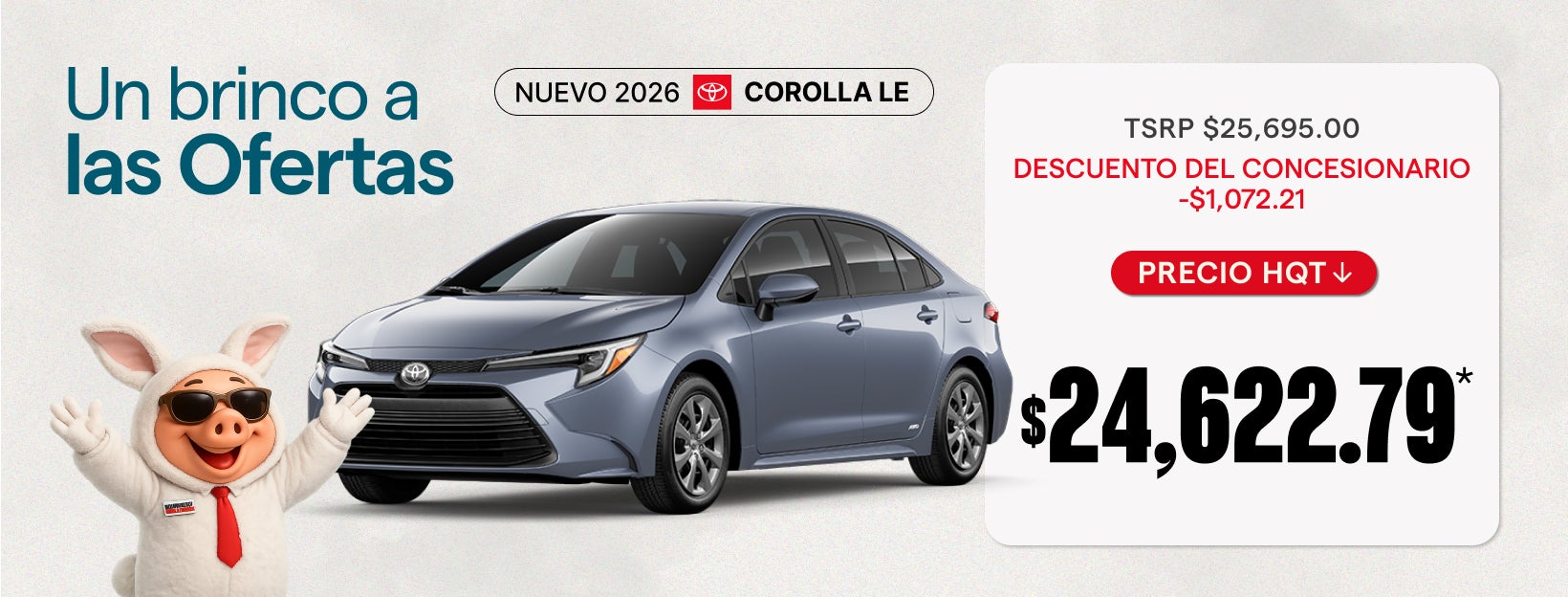 *2026 Toyota Corolla LE. Modelo# 1852. VIN# T5YFB4MDEXTP436083 Precio sugerido (SRP): $25,695.00 Ahorro $1072.21 Precio de venta: $24,622.79.14 Todos los precios anunciados por Headquarter Toyota excluyen impuestos, título, licencia, registro y los siguientes cargos: un cargo por servicio de preentrega de $1,094, una tarifa de presentación electrónica de registro de $54.75 y una tarifa de $13 de una agencia privada de placas de terceros (estos cargos representan costos y ganancias para el concesionario por conceptos tales como inspeccionar, limpiar y ajustar los vehículos, y preparar los documentos relacionados con la venta o el arrendamiento). Los precios tampoco incluyen ningún accesorio opcional seleccionado por el cliente. Intentamos actualizar este inventario regularmente; sin embargo, puede haber un tiempo de demora entre la venta de un vehículo y la actualización del inventario. Imágenes solo con fines ilustrativos. Consulte al concesionario para obtener todos los detalles. La oferta expira el 05/04/2026