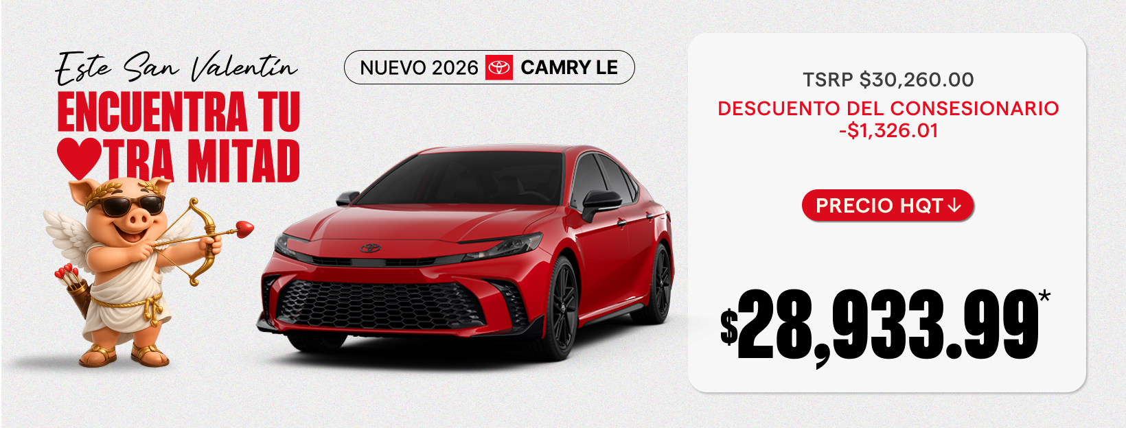 *Toyota Camry LE 2026. Modelo# 2559. VIN# 4T1DAACKXTU703454 TSRP: $30,260 Ahorro: $1,326.01 Precio de venta: $28,933.99 Debe tomar entrega del inventario en stock del concesionario. Imágenes solo con fines ilustrativos. Las ofertas no pueden combinarse con ciertas otras ofertas, consulte al concesionario para más detalles. Todos los precios anunciados por Headquarter Toyota excluyen impuestos, título, licencia, registro y los siguientes cargos: un cargo de servicio de preentrega de $1,094, una tarifa de presentación electrónica de registro de $54.75 y una tarifa de agencia privada de placas de terceros de $13 (estos cargos representan costos y ganancias para el concesionario por conceptos como inspección, limpieza y ajuste de vehículos, y preparación de documentos relacionados con la venta o el arrendamiento). Los precios tampoco incluyen accesorios opcionales seleccionados por el cliente. Debe tomar entrega antes de que la oferta venza el 3/2/2026